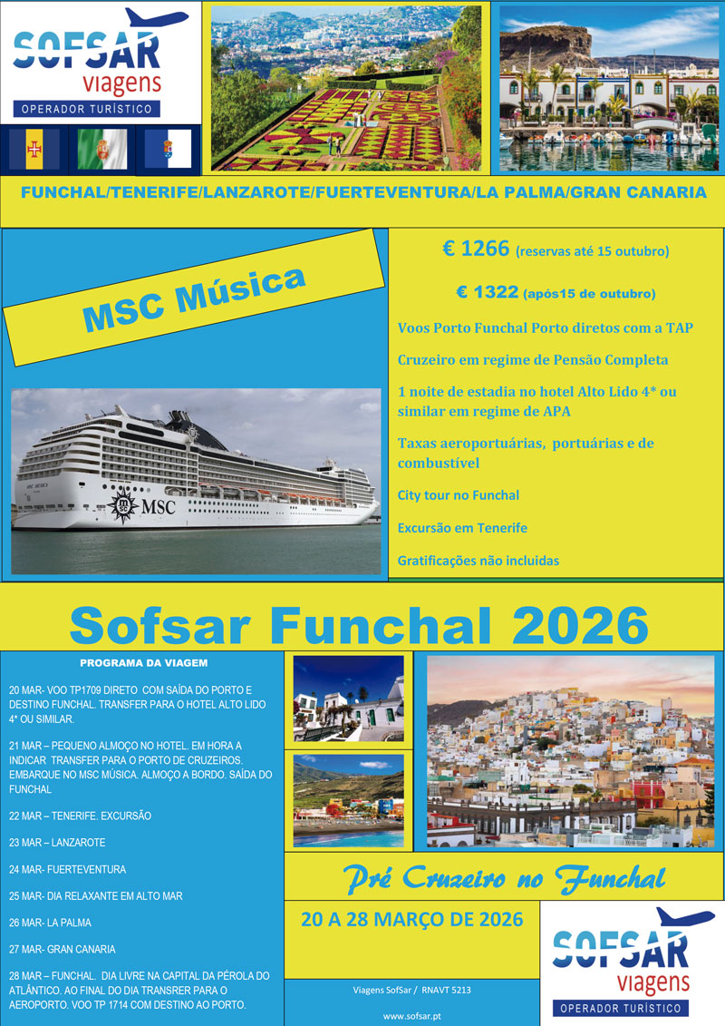 Voos Porto Funchal Porto diretos com a TAP; Cruzeiro em regime de Pensão Completa; 1 noite de estadia no hotel Alto Lido 4* ou similar em regime de APA; Taxas aeroportuárias, portuárias e de combustível; City tour no Funchal; Excursão em Tenerife; Gratificações não incluidas.